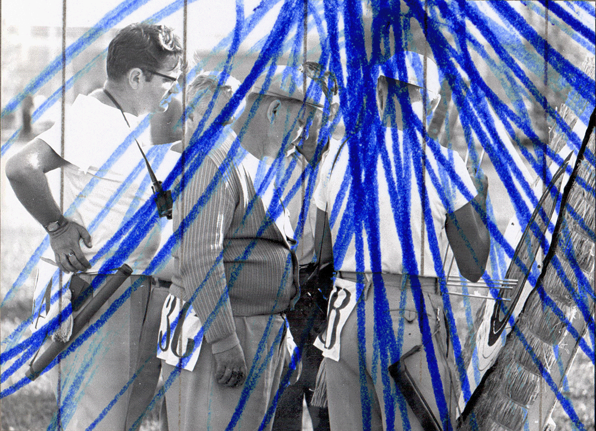 By interrupting the clarity of the original photographs, the series explores how “evidence” and collective memory are always mediated. The gesture acts like noise, censorship, or a heightened diagram, amplifying themes of discipline, numbering, and control already present in sport imagery. Installed as physical prints, the works sit between mechanical capture and human insistence, asking the viewer to look through interference and question what gets preserved, overwritten, or made invisible.